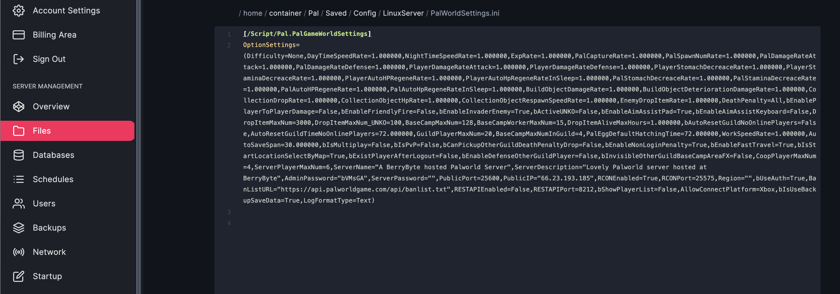 - Navigate to Pal -> Saved -> Config -> LinuxServer -> PalWorldSettings.ini